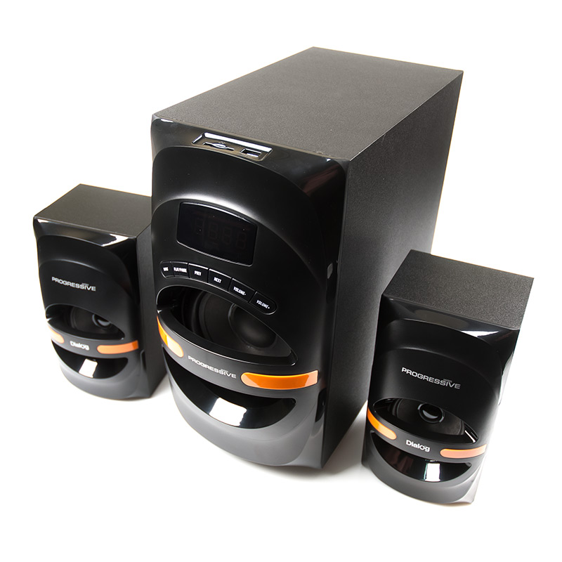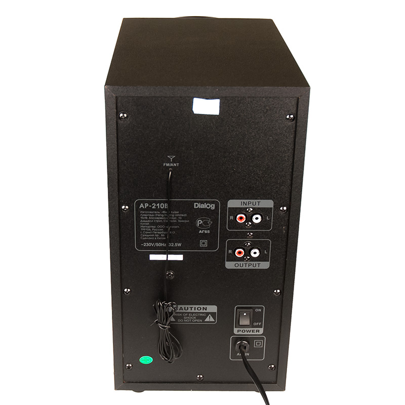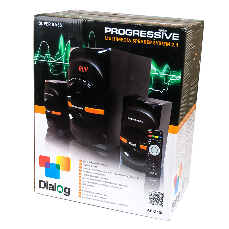 Активная акустическая система 2.1 c Bluetooth Dialog Progressive AP-210B| Технические характеристики | | Модель | AP-210B | | Мощность RMS (Вт) | 60 | | Поддержка Bluetooth | Да, Bluetooth v4.0 | | USB вход | Да | | Поддержка карт SD (Secure Digital) | Да. SD, а также miniSD и microSD (через переходник, приобретаемый отдельно) | | FM радио | Да, память на 20 радиостанций | | Усилитель | встроенный | | Компоненты | сабвуфер, два сателлита | | Соотношение сигнал/шум | >80 | | Гармонические искажения | не более 0.3% при мощности 1 Вт и полосе 1 кГц | | Блок питания | встроенный | | Входы | стереовход (2RCA); USB порт для флэш-накопителей; Слот для SD карт; беспроводное Bluetooth соединение | | Управление | сабвуфер: питание, регулятор громкости, переключение источника сигнала, пауза/воспроизведение, вперед/назад (по трекам или радиостанциям); пульт ДУ: подробное описание в руководстве пользователя | | Пульт ДУ | пульт ДУ | | Индикация | четырехсимвольный дисплей на сабвуфере | | Длина сетевого кабеля (м) | 1,5 | | Сабвуфер | | | Динамик(и) | 5.25″ | | Мощность (Вт) | 30 | | Сопротивление (Ом) | 4 | | Частотный диапазон (Гц-Гц) | от 40 Гц | | Материал диффузора | бумага | | Фазоинвертор | труба на нижней стенке | | Магнитное экранирование | да | | Корпус | MDF, 9 мм | | Габаритные размеры (В*Ш*Г, мм) | 325*310*170 | | Вес (кг) | 3,9 | | Сателлиты | | | Динамик(и) | 3″ | | Мощность (Вт) | 15 | | Сопротивление (Ом) | 4 | | Частотный диапазон (Гц-КГц) | до 20 кГц | | Материал диффузора | бумага | | Магнитное экранирование | да | | Корпус | MDF, 5 мм | | Габаритные размеры (В*Ш*Г, мм) | 200*110*110 | | Вес (кг) | 0,54 | | Комплект поставки | сабвуфер, два сателлита, кабель для подключения к источнику сигнала 2RCA->3.5 мм стерео джек, беспроводной пульт ДУ, руководство пользователя, гарантийный талон, упаковка | | Код ТНВЭД | 8527919900 | | Гарантийный срок, мес. | 12 | | Cрок службы, мес. | 60 |
