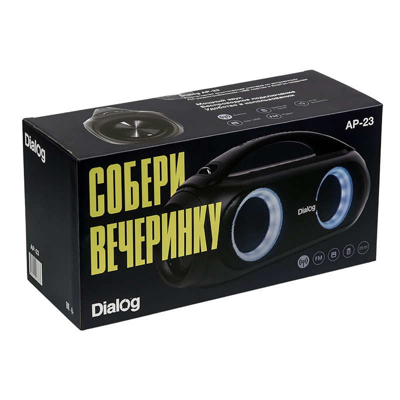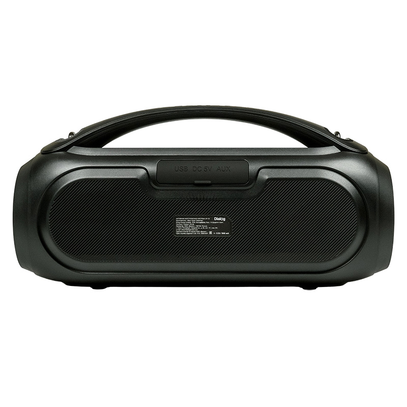 Портативная акустическая система Dialog Progressive AP-23| Технические характеристики | Модель перенесена в архив 07.10.2023 | | Модель | AP-23 | | Тип | Портативная | | Формат | Моно | | Мощность системы RMS (Вт) | 25 | | Беспроводной интерфейс | Да. Поддержка Bluetooth v5.1+BR+EDR | | Поддержка режима TWS | Да. Можно сформировать стереопару из двух одинаковых колонок | | Аккумулятор | встроенный Li-Ion аккумулятор 3000 мА*ч, 3.7В | | Powerbank режим | Да, может заряжать подключенные устройства по USB. Выходной ток 5В 2А | | Поддержка USB флэш накопителей | Да | | Слот для карт памяти SD (Secure Digital) | Нет | | FM-радиоприемник | Да, встроенная антенна | | Поддерживаемые тип и размер файловой системы | до 32 Гб, FAT16 или FAT32 | | Поддерживаемые форматы файлов | MPEG-1 Audio Layer 3 (MP3) с битрейтом 64 — 320 Кбит/с, FLAC, WAV, WMA | | Компоненты | переносная беспроводная акустическая система | | Усилитель | встроенный | | Соотношение сигнал/шум, Дб | 60 | | Гармонические искажения | <10% | | Блок питания | Встроенный аккумулятор либо питание от USB интерфейса (Постоянный ток 5В / 500 мА) | | Входы | AUX Line-in (миниджек 3.5 мм) | | Микрофонный вход | нет | | Выход на наушники | нет | | Караоке | Нет | | Управление | питание вкл/выкл, воспроизведение/пауза/поиск радиостанций, следующая запись/радиостанция (увеличение громкости длительным нажатием), предыдущая запись/радиостанция (уменьшение громкости длительным нажатием), вкл/выкл. режима TWS, вкл/выкл. динамической подсветки | | Пульт ДУ | Нет | | Индикация | светодиодный четырёхсегментный индикатор заряда аккумулятора | | Цветомузыка | Да, RGB цветомузыка на обоих динамиках | | Динамик(и) | 2*3″ + 2″ + пассивные динамики 2*3″ | | Мощность (Вт) | 25 | | Сопротивление (Ом) | 4 | | Частотный диапазон (Гц-КГц) | 70-16 | | Корпус | пластик | | Гриль | Несъемый металлический гриль чёрного цвета | | Размер корпуса (В*Ш*Г, мм) | 180*360*130 | | Вес (кг) | 2,26 | | Ремень для переноски | Металлические проушины для крепления ремня (в комплекте не поставляется) | | Комплект поставки | акустическая система - 1 шт, кабель TRS 3.5мм "джек" => TRS 3.5мм "джек" для подключения к источнику сигнала - 1 шт, кабель для подзарядки аккумулятора USB- Micro USB type C - 1 шт, гарантийный талон - 1 шт, упаковка - 1 шт | | Код ТНВЭД | 8527919900 | | Гарантийный срок, мес. | 12 | | Cрок службы, мес. | 60 |