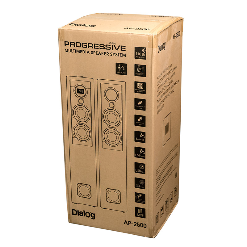 Активная акустическая стереосистема c DSP, Bluetooth, караоке, кардридером, USB портом, FM радио и цифровыми входами Dialog Progressive AP-2500 Black| Технические характеристики | | Модель | AP-2500 Black | | Тип | Напольная | | Формат | Стерео | | Мощность системы RMS (Вт) | 110 | | Беспроводной интерфейс | Да. Поддержка Bluetooth v4.2 | | Поддержка USB флэш накопителей | Да | | Слот для карт памяти SD (Secure Digital) | Да, MicroSD (TransFlash) | | FM-радиоприемник | Да, внешняя гибкая антенна (стационарно подключена к задней панели). Длина антенны - 1 м | | Поддерживаемые тип и размер файловой системы | до 32 Гб, FAT16 или FAT32 | | Поддерживаемые форматы файлов | MPEG-1 Audio Layer 3 (MP3) с битрейтом 64 — 320 Кбит/с, FLAC, WAV | | Компоненты | напольные стереоколонки | | Усилитель | встроенный | | Соотношение сигнал/шум, Дб | 65 | | Гармонические искажения | ВЧ и СЧ <2%, НЧ < 10% | | Декодер | Да | | Блок питания | Встроенный. Переменный ток 230 В / 50 Гц | | Входы | Линейный вход AUX (2xRCA), цифровой оптический вход S/PDIF TOSLINK, цифровой коаксиальный вход S/PDIF RCA, два микрофонных входа 6,3 мм джек | | Микрофонный вход | да | | Выход на наушники | нет | | Караоке | Да. Есть регуляторы громкости и реверберации (эхо) | | Проводной микрофон | Да. Два микрофонных входа jack (6,35 мм, 1/4'') | | Управление | На верхней панели: питание вкл/выкл, регулятор громкости, следующая запись (вперёд по треку длительным нажатием), предыдущая запись (назад по треку длительным нажатием), воспроизведение/пауза, выбор режима (источника звука), поиск и сохранение FM радиостанций, следующая радиостанция, предыдущая радиостанция, переподключение Bluetooth; На задней панели: регулятор громкости караоке микрофонов, регулятор реверберации (эхо) караоке микрофонов | | Пульт ДУ | Да. ИК пульт, 14 кнопок; размеры (Ш*Д*Г, мм) 40*149*20, питание от двух батареек типа ААА (LR-03) | | Индикация | четырехсимвольный дисплей на фронтальной панели активной колонки (тёмные символы, дисплей с молочно-голубой подсветкой) | | Межблочный кабель | Отдельный кабель, подсоединяется к колонкам через зажимы. Длина 6 метров, сечение 2*0,5мм2 | | Длина сетевого кабеля (м) | отсоединяемый кабель (Евроразъём IEC C7 - евровилка CEE 7/16 Type C), длина 1,5 м | | Динамик(и) | НЧ 8″ + СЧ 2x4″ + ВЧ 0.75″ | | Мощность (Вт) | 55 | | Сопротивление (Ом) | НЧ 4 Ом, СЧ и ВЧ 8 Ом, | | Частотный диапазон (Гц-КГц) | 20-20 | | Материал диффузора | ВЧ - майлар, НЧ и СЧ - бумага | | Фазоинвертор | труба в нижней части передней панели, D=65мм, L=130мм | | Корпус | MDF, 12 мм | | Гриль | Несъемый текстильный гриль на НЧ и СЧ динамиках | | Размер корпуса (В*Ш*Г, мм) | 780*165*325 | | Вес (кг) | 22,00 | | Комплект поставки | правая колонка - 1 шт, левая колонка - 1 шт, ИК пульт дистанционного управления - 1 шт, межблочный кабель для соединения колонок - 1 шт, кабель 2x RCA-M => TRS 3.5 мм «джек» для подключения к источнику сигнала - 1 шт, кабель Toslink цифровой оптический для подключения к источнику цифрового сигнала - 1 шт, кабель цифровой коаксиальный RCA-RCA для подключения к источнику цифрового сигнала - 1 шт, переходник 2x RCA (m) - TRS 3.5 мм "джек" (f) - 1 шт, кабель питания ~230В – 1 шт, руководство пользователя с гарантийным талоном - 1 шт, упаковка – 1 шт | | Код ТНВЭД | 8527919900 | | Гарантийный срок, мес. | 12 | | Cрок службы, мес. | 60 |