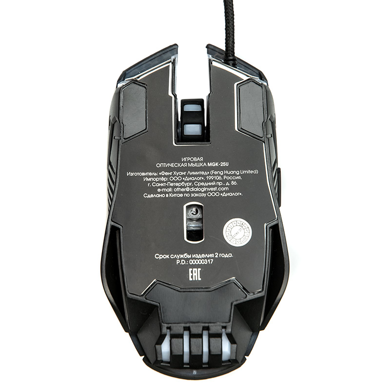 | Модель | MGK-25U | | Интерфейс | USB | | Тип | Оптическая (видимый диапазон) | | Разрешение, CPI | 800/1200/1600/2400 | | Динамически изменяемое разрешение | Да | | Кнопка изменения разрешения | DPI | | Изменение разрешения | циклическое | | Материал корпуса | верх: матовый черный софт-тач с полупрозрачной ячеистой фактурой. Боковины: черный пластик с противоскользящим тиснением. Металлический жесткий каркас. | | Количество кнопок | 6 | | Прокрутка | вертикальная | | Особенности модели | Ферритовое кольцо перед USB коннектором, кабель со скруткой на "липучке". Большая мышь для пользователей с крупной ладонью. Корпус мыши симметричен по продольной оси, но кнопки "вперед/назад" расположены на левой стороне. | | Длина кабеля, м | 1,5 | | Текстильная оплётка кабеля | да | | Размеры (В*Ш*Г, мм), max | 125*67*41 | | Вес нетто, г. (без кабеля/батареек/грузиков и т.п.) | 118 | | Комплект поставки | мышь - 1 шт, гарантийный талон - 1 шт, упаковка - 1 шт | | Код ТНВЭД | 8471607000 | | Гарантийный срок, мес. | 6 | | Cрок службы, мес. | 24 |